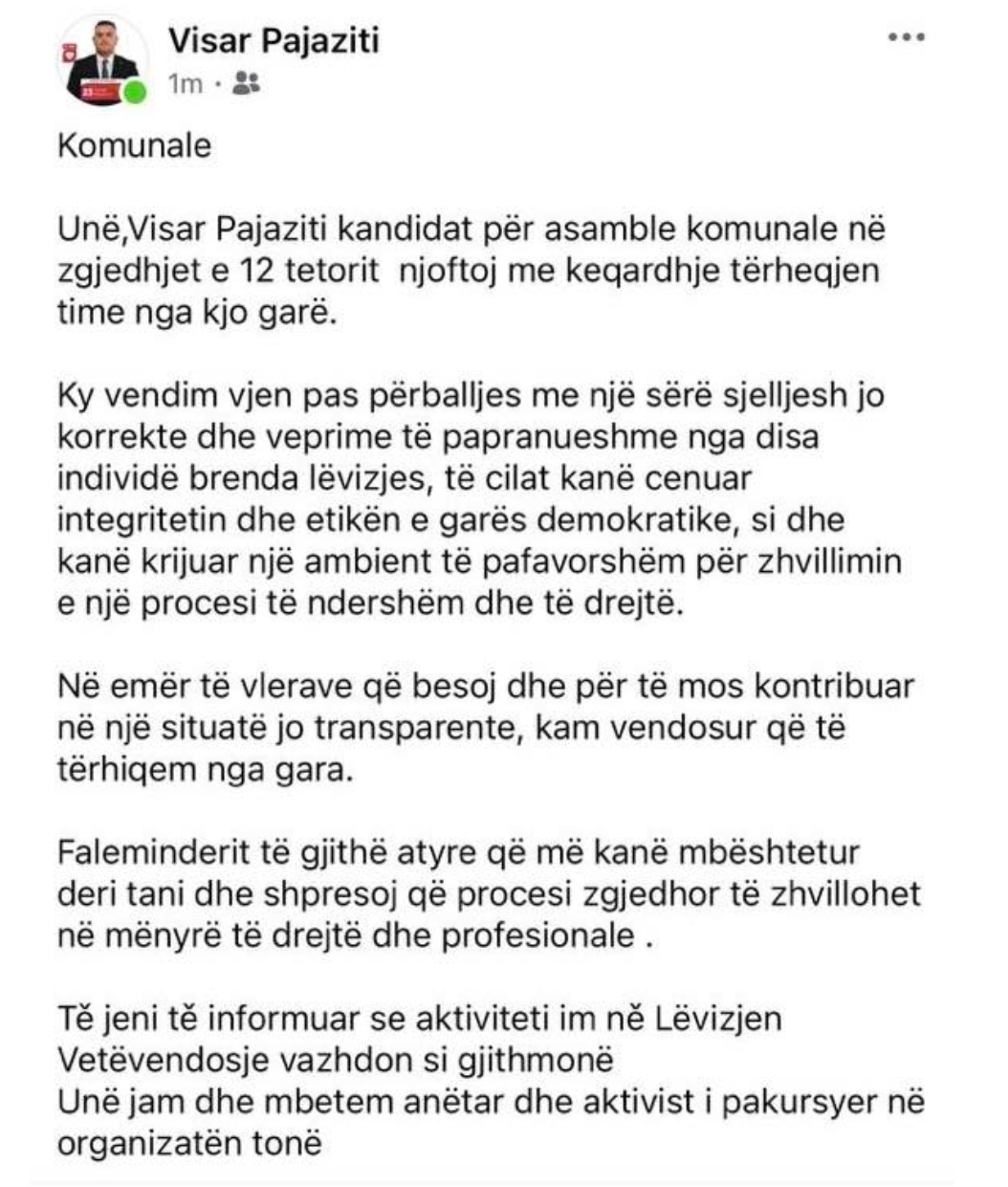 Kandidati i Lëvizjes Vetëvendosje për Kuvendin Komunal të Ferizajt, Visar Pajaziti, ka njoftuar përmes një postimi në Facebook se me keqardhje ka vendosur të tërhiqet nga gara për zgjedhjet e 12 tetorit.